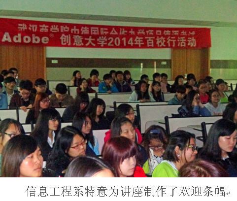 本报讯(记者 黄秀丽)2014年4月24日,伴随着绵绵春雨,Adobe创意大学百校巡讲走进威廉希尔williamhill官网。此次讲座由信息工程系主办,并邀请了Adobe创意大学特聘讲师储溪流于南区投八多媒体大教室主讲“创意与前沿的信息技术”并结合学生所学专业的前景问题,阐述Adobe认证对学生的重要性,讲座内容涉及平面动漫影视、新媒体、技术与技能、就业与认证等等,参加本次讲座的有数字城市专业、多媒体专业等300多人,学生们踊跃回答问题,气氛热烈。