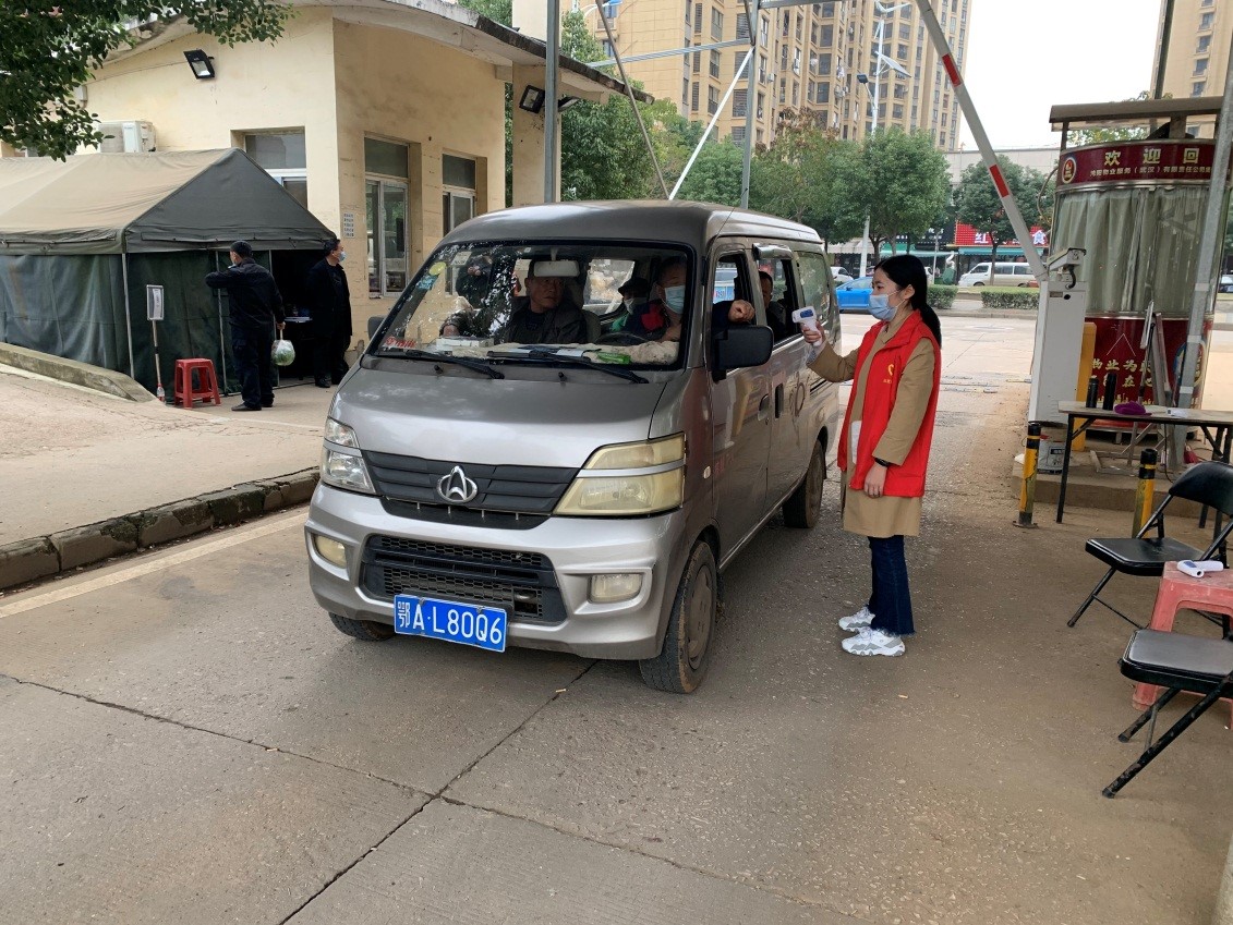 黄雅晶老师带领3名学生值守永久社区东门门岗,负责为进出门岗的行人和车辆司机测量体温,并对外卖员和快递员进行信息登记。