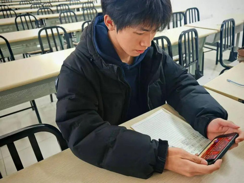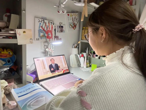 图5 2024级数据科学与大数据技术专业学生丁咏在宿舍观看直播