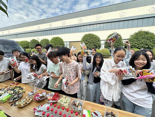 随后,来到湖北贤哥食品有限公司。大家参观了食品生产的各个环节,从原材料筛选到成品包装的每一道工序都严格遵循标准化流程,让同学们对食品生产行业有了更直观的认识,也体会到了企业在品质把控和品牌建设方面的努力。这一站对威廉希尔williamhill官网的同学来说,多了一份游学的意味,每人还获赠一个小礼包品尝到一份有心意的美食。
