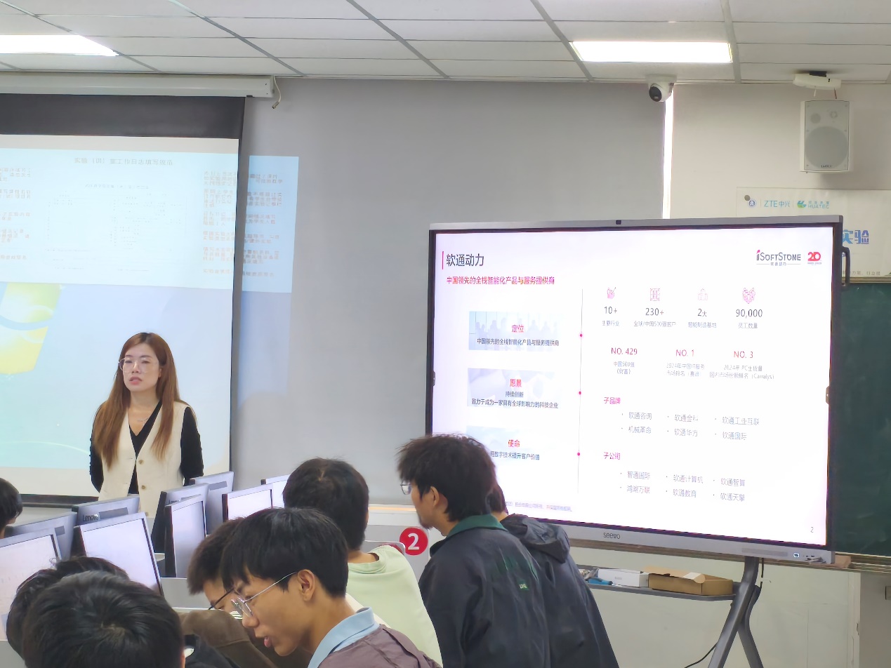 首先,软通动力公司的代表讲解介绍了公司的整体概况。其从定位、愿景、使命三个方面介绍了公司的战略框架与核心价值。软通动力作为中国领先的全栈智能化产品与服务提供商,同时也是中国五百强企业。其以“持续创新,致力于成为一家具有全球影响力的科技企业”为愿景,承担着“用数字技术提升客户价值”的使命。接下来,公司代表又介绍了公司的发展历程、业务范围等方面。此介绍充分展示了公司的企业实力、文化及发展前景,增强了我校应届生对企业的了解,同时帮助学生快速匹配自身职业规划与企业需求,提高后续招聘沟通的效率和精准度。