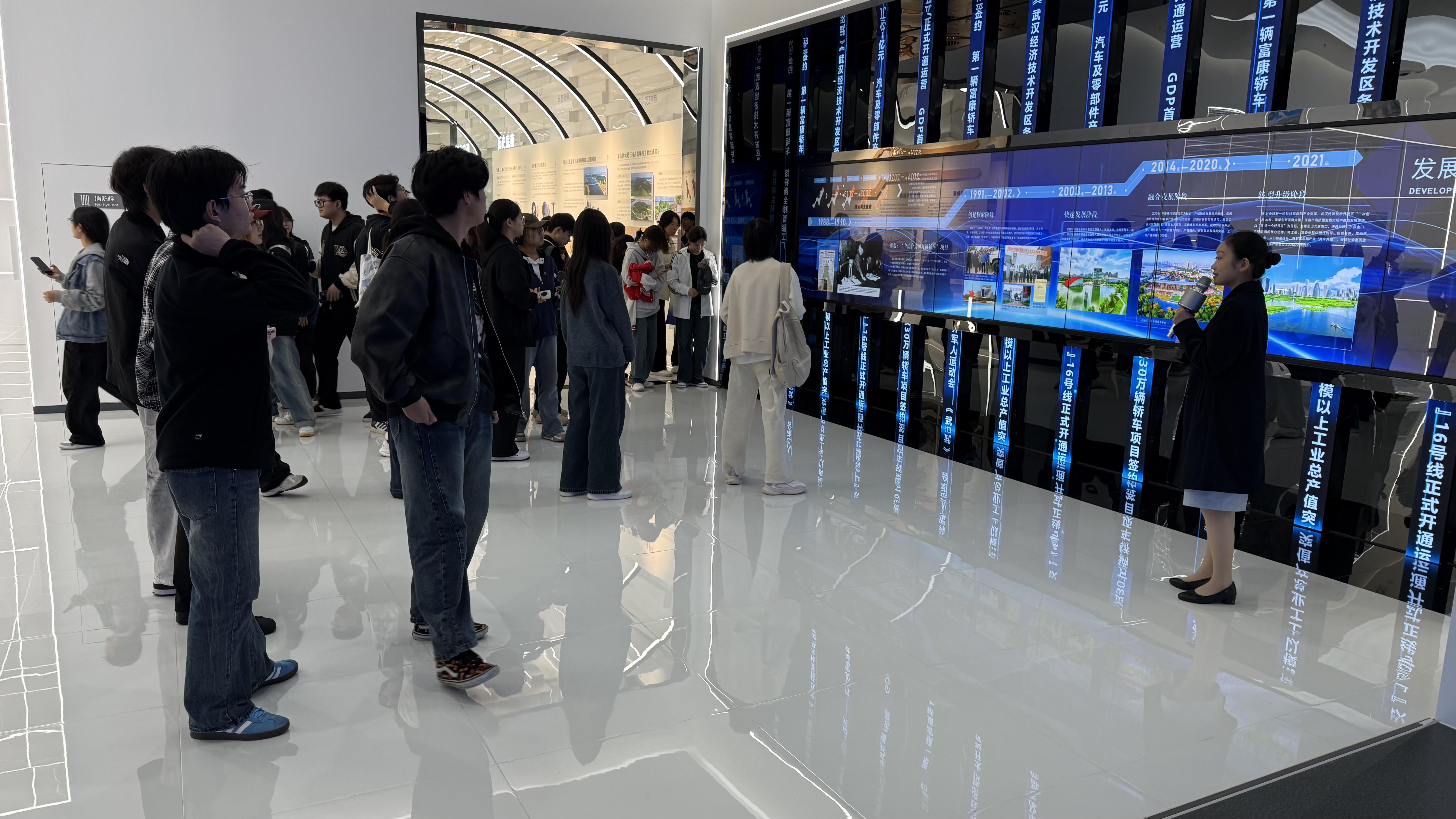 最后第四站,同学们走进武汉经济技术开发区(汉南区)规划展示中心,也简称“车谷展示中心”,系统了解了武汉经开区从一片田野发展为现代化产业新城的开拓历程,深刻感受了其在汽车制造、智能制造、数字经济等重点领域形成的完整产业链与集群优势。在“萝卜快跑”自动驾驶演示与互动环节,同学们亲身体验了智能网联车辆的实际运行,深切感受到科技创新从实验室走向现实应用的突破与魅力。在亲身体验自动驾驶车辆后,2025级人工智能专业陈一可表示:“它让我对感知算法的重要性有了更深理解,我要努力学好计算机视觉相关课程。”