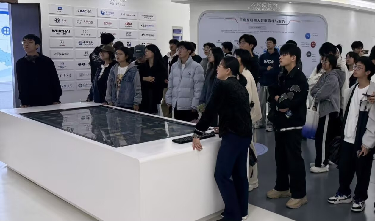 随后,师生前往第二站大唐互联科技(武汉)有限公司,沉浸式体验了该公司工业互联网创新中心与办公区域。该中心内,实时跳动的数据大屏直观展示了工业互联网如何织就“神经网络”、人工智能如何驱动“智慧大脑”。讲解员通过具体应用案例,将算法与数据模型如何优化生产、实现预测性维护等内容娓娓道来,让同学们对“人工智能赋能工业制造”从“前端操作”到“后端智能”有了更完整的认知。2025级人工智能专业余翔感慨道:“数据大屏上实时展示的生产动态及其优化算法让我很受启发,让我直观地看到了AI算法在工业领域的实际应用价值。”