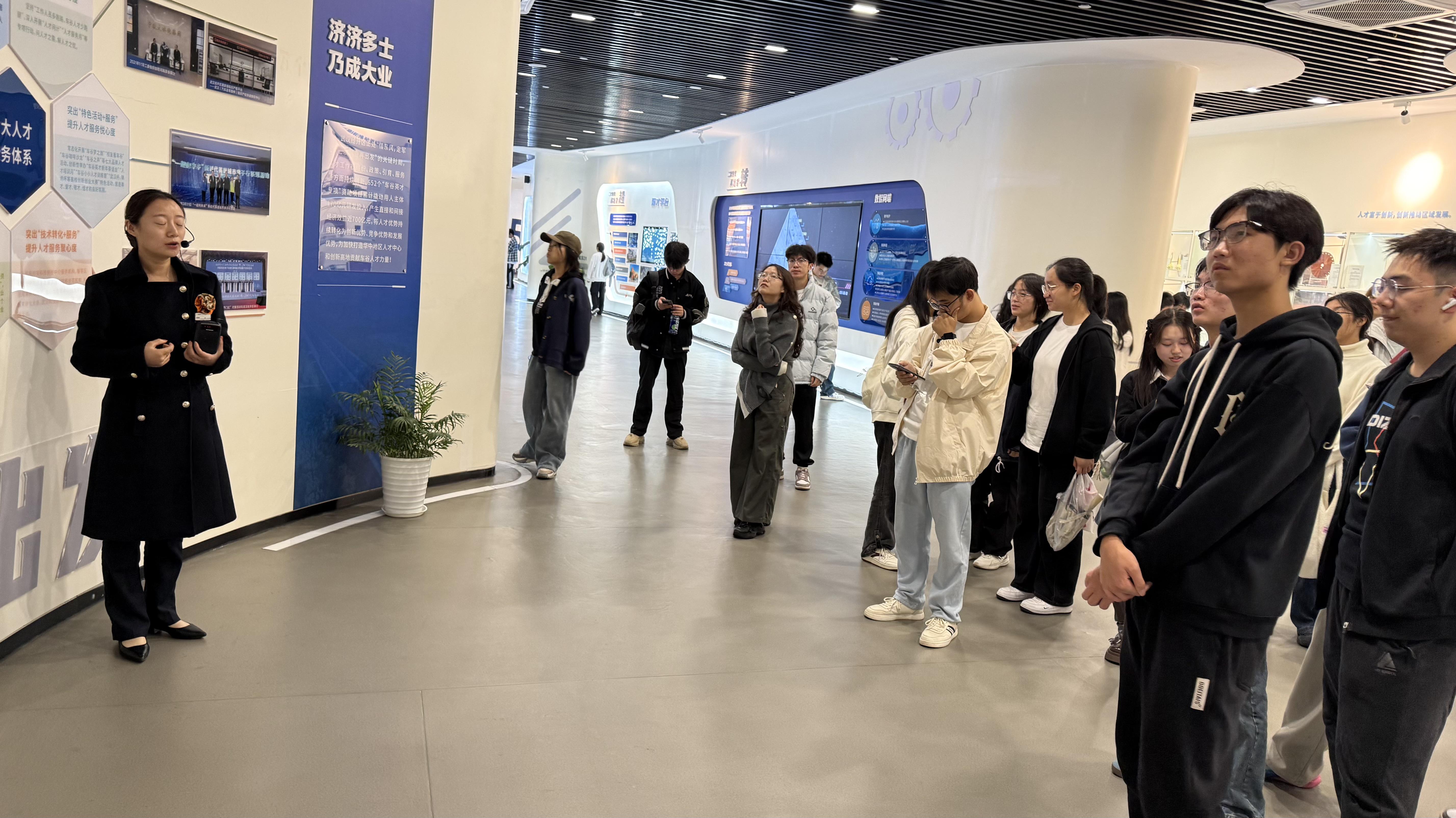 在第三站车谷人才创新港,同学们观看了武汉经开区的发展规划与科技成果展示,近距离观摩新能源汽车核心部件、智能网联汽车自动驾驶等前沿成果。工作人员详细介绍了武汉经开区在新能源与智能网联汽车领域的未来发展方向,以及该区为吸引大学生“来沌留沌”提供的创业扶持、技能提升、政策对接等全方位人才服务。在企业合作生态展示墙前,同学们围绕人才政策、项目孵化、实习岗位等内容积极提问,现场互动热烈。看到这么多车企在招聘软件工程师,让2025级软件工程专业武家荣乾对未来的就业有了明确方向,表示将来想从事智能座舱软件开发。