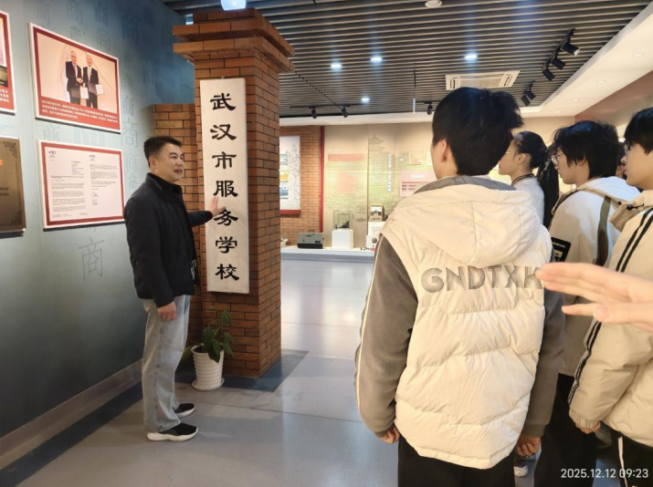 在庄重典雅的校史馆内,姚层林院长以学校发展的关键阶段为脉络,依托馆内丰富的实物展陈、珍贵档案与历史图片,为同学们展开一场深入浅出、情感充沛的讲授。步入展厅,一块写着“武汉市服务学校”的泛黄木质校牌首先映入眼帘。轻抚校牌,姚院长将时光拉回1963年:为响应武汉市服务行业人才需求,学校在东西湖慈惠农场的一家酱品厂中创办。尽管条件艰苦,学校紧扣民生,开设了制冷空调、美容美发、照相摄影、烹饪等实用专业,奠定了今日威廉希尔williamhill官网相关学院的雏形。“创校精神中最重要的人文历程,就是在酱品厂里办教育。”姚院长感慨道。