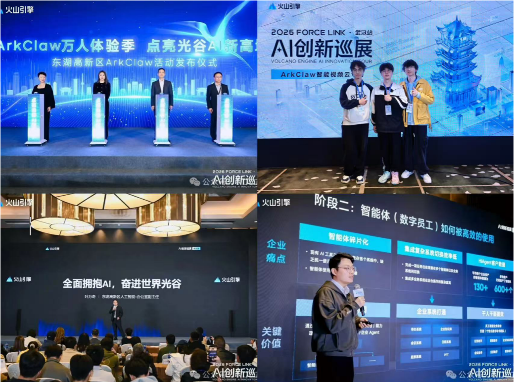 在主论坛环节,来自火山引擎及相关企业的技术专家围绕“全面拥抱AI,奋进世界光谷”“大模型驱动产业创新”等主题进行了深入分享,系统介绍了ArkClaw等平台在政务服务、企业数字化转型中的应用实践,展现了人工智能从技术突破走向产业赋能的发展趋势。